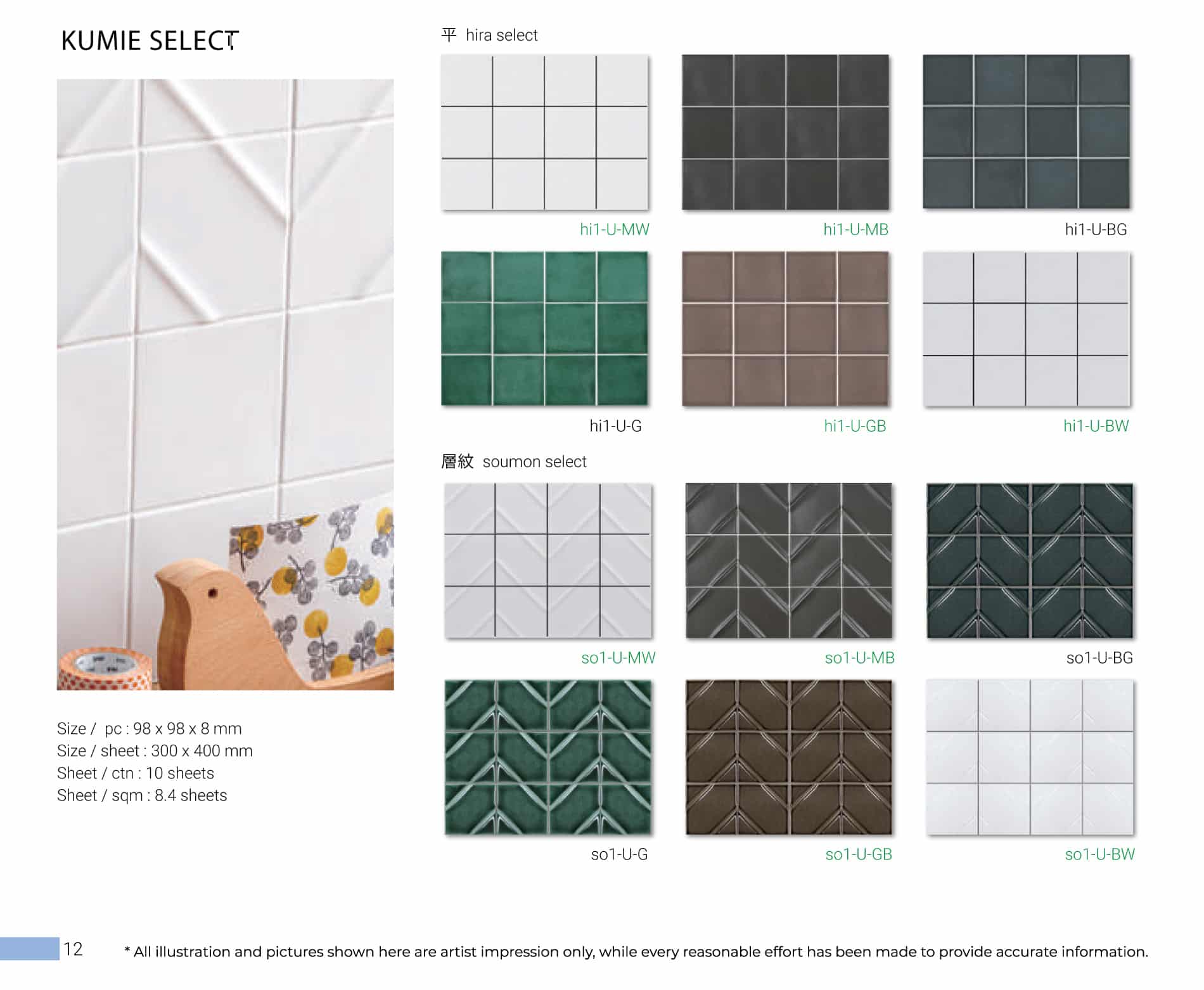 Kumie Select is our latest Japanese tile collection, shaped by a minimalist approach and a lustrous colour presence that adds depth without excess. Imported directly from Japan, it comes in a 300 × 400 mm sheet format, ideal for kitchen and bathroom walls. The clean grid and subtle geometry create a calm, organised layout, while tones from soft whites to deep greens and charcoal introduce quiet richness. Light movement reveals gentle variation across the surface, keeping it visually engaging.