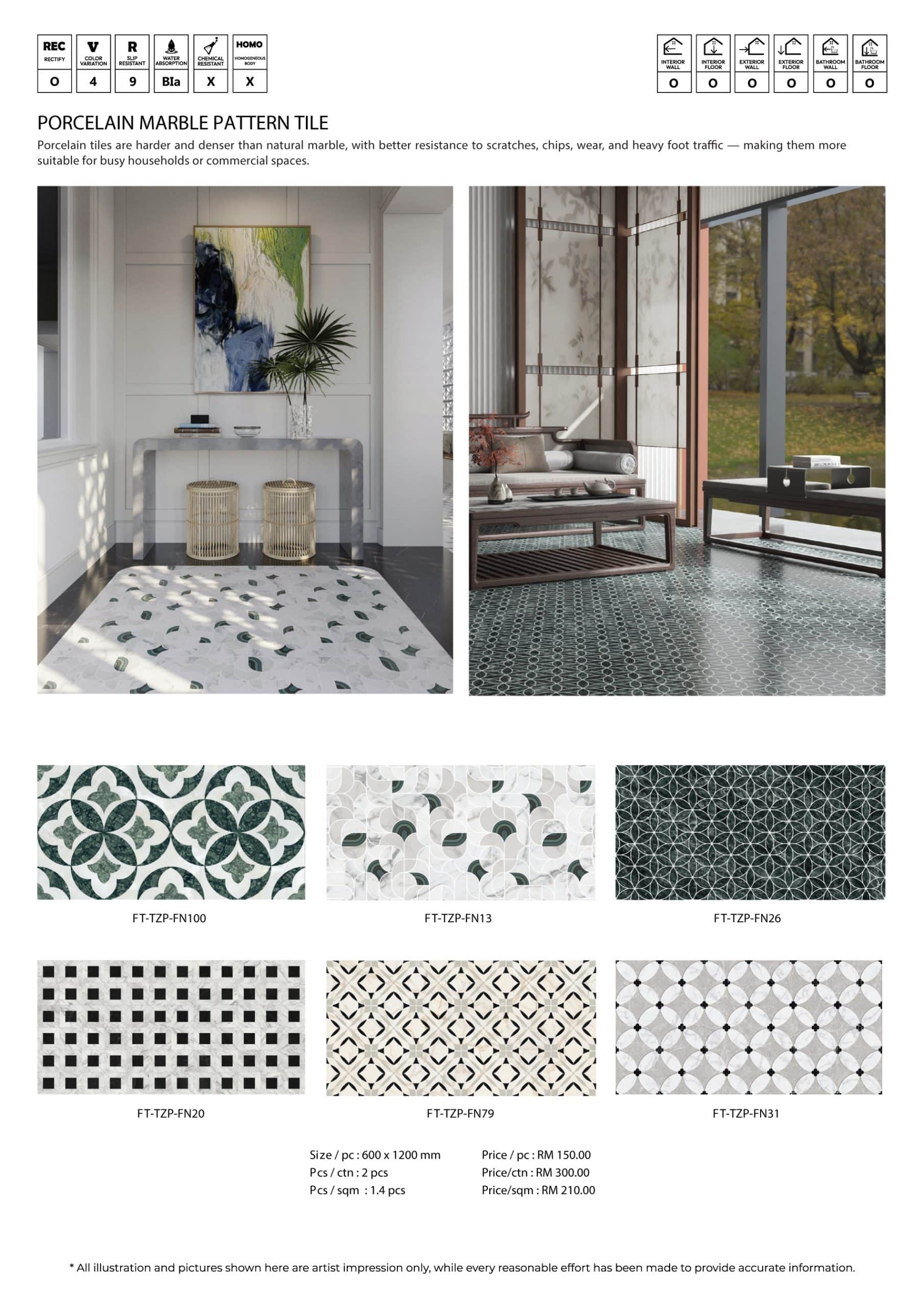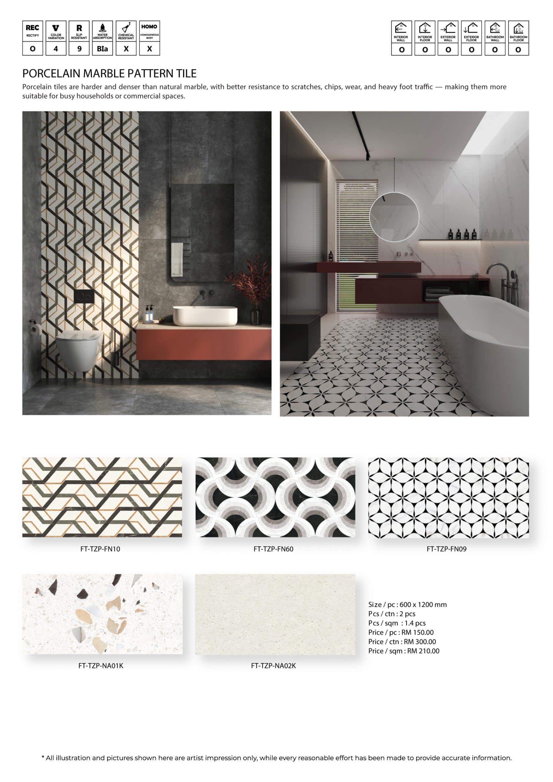 Porcelain Marble Pattern Tiles bring the elegance of marble with the strength of porcelain. This collection is dense and durable, and it is designed to handle heavy foot traffic, so it suits busy homes and commercial spaces. In a 600 x 1200 mm format, the patterns read clean and modern, with crisp motifs that add movement without overwhelming the room. Use them on floors or feature walls in the living area, kitchen, or bathroom for a refined statement that stays practical, even in high moisture and everyday conditions. Fewer grout lines help the surface look continuous and easier to clean. It delivers a contemporary finish from GNG Tiles Malaysia.