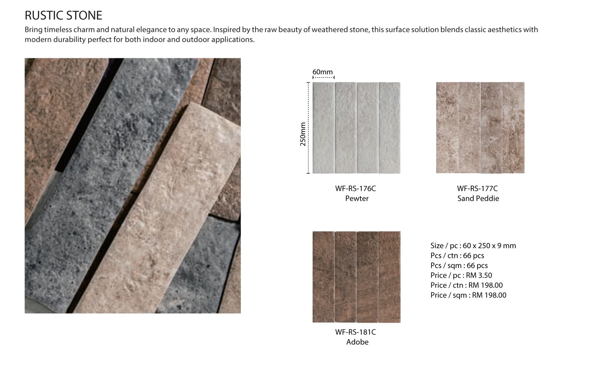 Written in the rocks, our new Rustic Stone Collection carries whispers of landscapes shaped by centuries of wind, water and sun. The series holds the raw poetry of nature, with textures that feel hand-carved by time itself. Its earthy tones bring warmth and grounding into interiors, turning kitchens into hearths of comfort and bathrooms into river-like sanctuaries. On outdoor terraces, Rustic Stone blends effortlessly with the horizon, echoing the balance between built form and the natural world. Paired with wood, metal or concrete, it softens sharp lines and lends depth to modern spaces. This collection is a connection to memory, place and permanence. It transforms design into storytelling, reminding us that beauty lies not in perfection but in the timeless traces nature leaves behind.